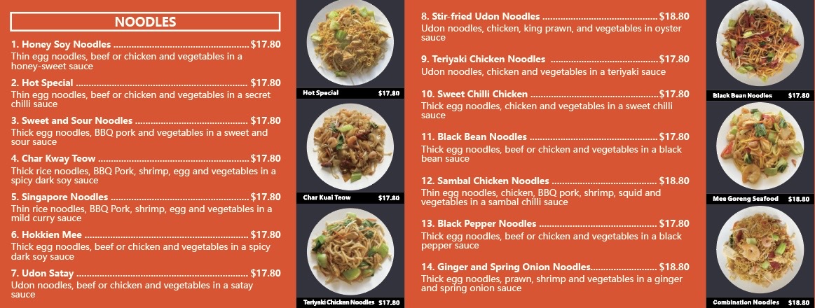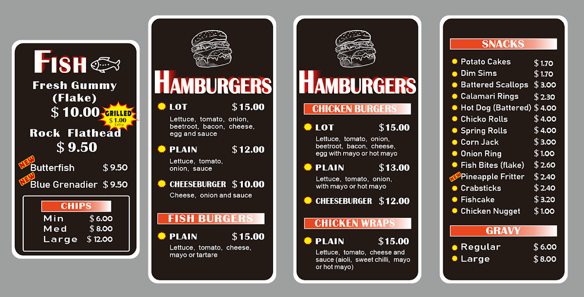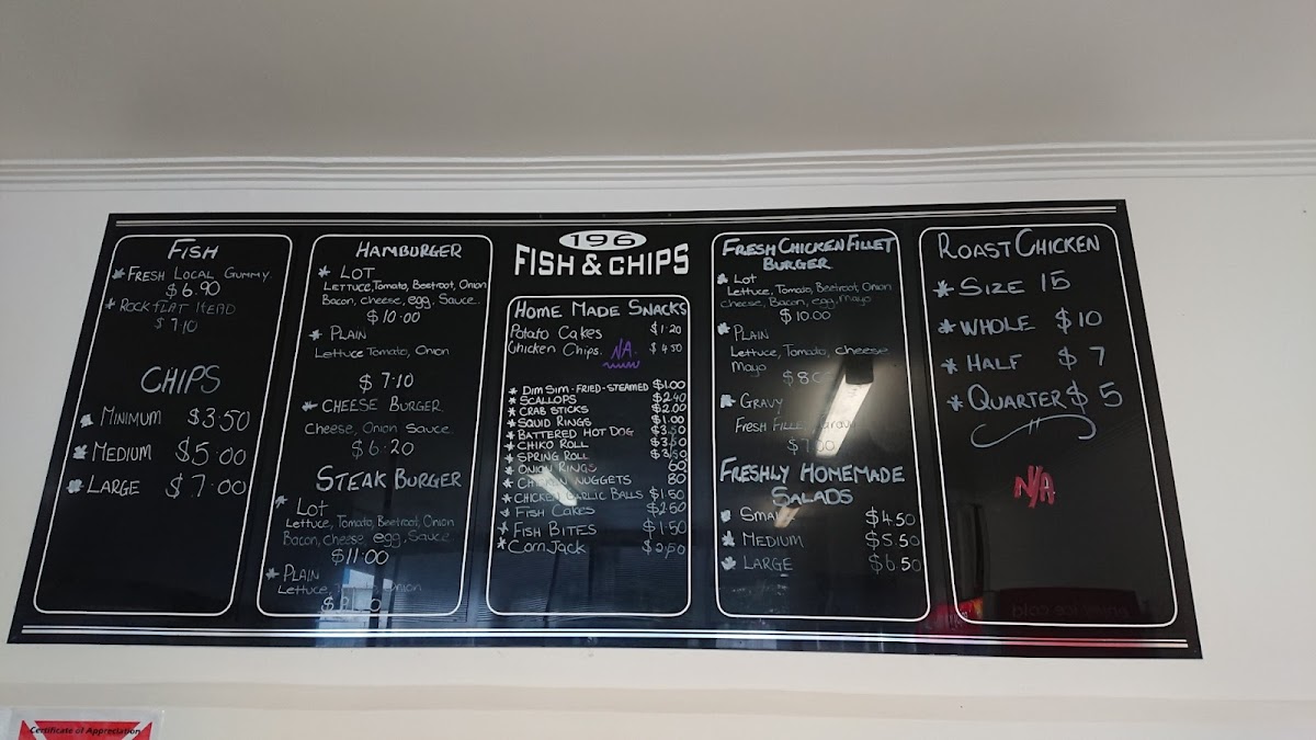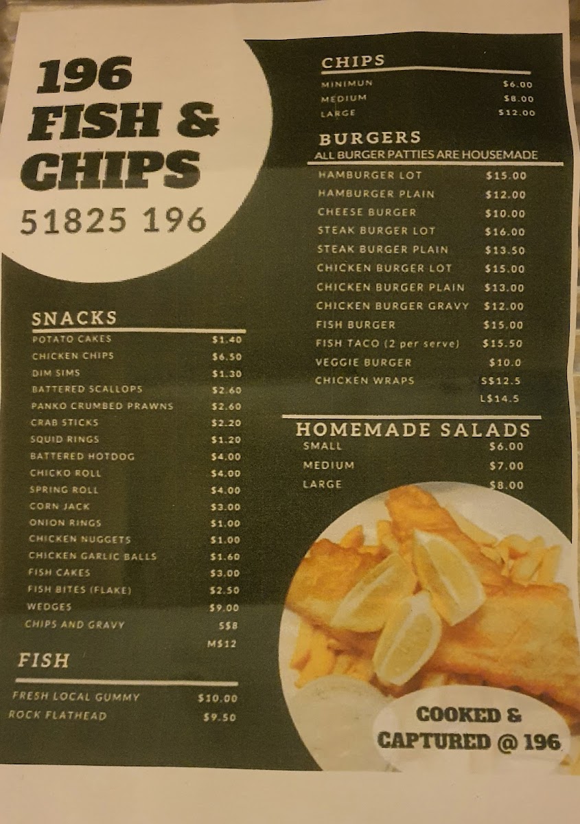 The menu at 196 Fish and Chips & Yarram Noodles offers a variety of satisfying options for every palate. For rice lovers, the Rice Box and Nasi Goreng are staples, with the Seafood Nasi Goreng and Sambal Chilli Rice adding a flavorful twist. The Combination Soup provides a warming option, perfect for those craving something light. The snack section features crispy delights like Potato Cakes, Chicken Chips, Panko Crumbed Prawns, Crab Sticks, and Squid Rings, all great for sharing or enjoying on their own. As for fresh seafood, the Fresh Local Gummy and Rock Flathead are notable choices. The burger selection is varied, with options such as the Hamburger Lot, Cheese Burger, and Steak Burger Lot catering to different tastes, along with their simpler counterparts like the Hamburger Plain and Steak Burger Plain. Noodle enthusiasts can choose from flavorful dishes like Honey Soy Noodles, Sweet and Sour Noodles, Char Kway Teow, and Singapore Noodles, each bringing a unique twist on traditional favorites. For those looking for something extra, the Lot, Plain, and Scallops offer additional tasty options. Overall, the menu is diverse, with plenty of choices to satisfy both hearty and light appetites.